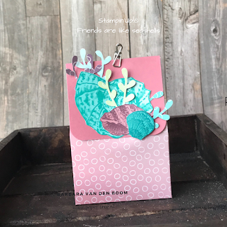 Voor deze kaart heb ik de grote schelp gemaskeerd, ik heb de schelp op een soort post it papier gestempeld en uitgeknipt deze plakte ik over de gestempelde schelp heen waar door het net is dat de bladeren achter de schelp licht.